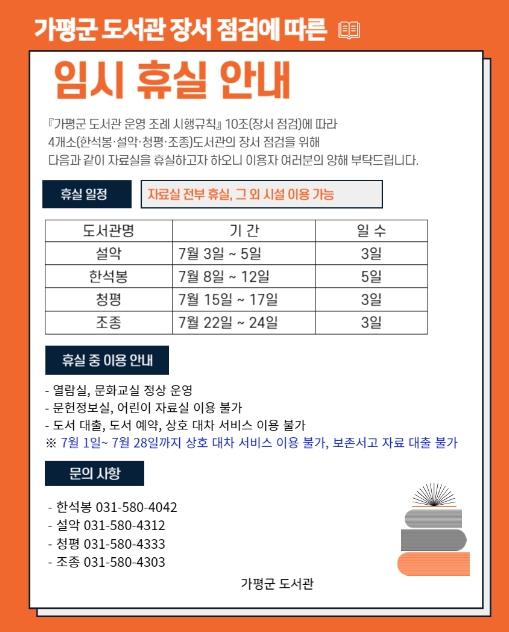 가평군은 관내 도서관 4곳이 장서점검을 위해 7월 3일부터 24일까지 순차적으로 임시 휴실한다고 28일 밝혔다.