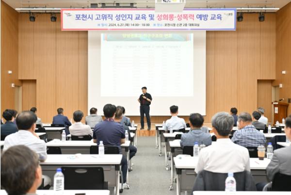 [한국뉴스타임=편집국] 포천시는 지난 27일 포천시청 신관 2층 대회의실에서 5급 이상 고위직 공무원과 유관기관장을 대상으로 건강한 조직문화를 조성하기 위한 성인지 교육 및 성희롱·성폭력 예방 교육을 실시했다.