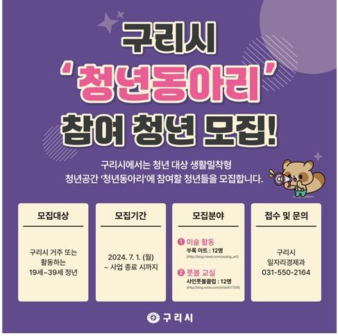 [한국뉴스타임=편집국] 구리시는 7월 1일부터 생활밀착형 청년공간 ‘청년동아리 운영’ 사업에 참여할 청년을 모집한다고 밝혔다.