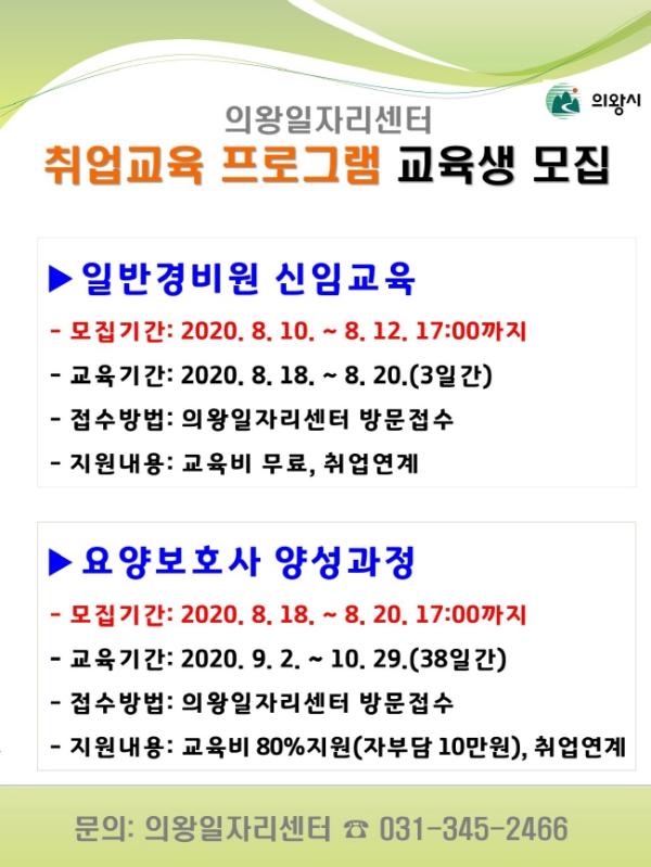 [KNT한국뉴스타임] 의왕시 일자리센터는 코로나19 확산에 따라 잠정 중단되었던 취업지원 프로그램을 8월부터 재개하고 프로그램 교육생을 모집한다고 6일 밝혔다.