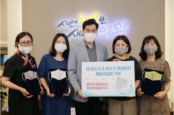 의왕시(시장 김상돈)는 5일 평생학습동아리 ‘꼼지락 매듭놀이’(회장 임춘화)에서 동아리 회원들이 직접 만든 면 마스크 50매와 분실방지 전통매듭 마스크 줄 50개를 고위험군 어르신을 위해 사용해 달라며 시에 기부했다고 밝혔다.