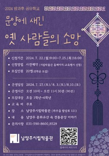[한국뉴스타임=편집국] 남양주시립박물관은 2024년 방과후 공유학교 프로그램 ‘문양에 새긴 옛 사람들의 소망’를 운영한다고 19일 밝혔다.
