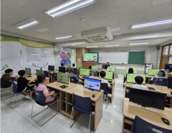 이번 교육은 디지털 교과서인 ‘지니버스’를 활용해 가상세계 속 교실에서 나만의 캐릭터를 만든 뒤 수업에 참여하는 참여형 교육으로 진행됐다.