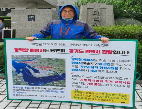 평택시에 따르면 평택시발전협의회 이동훈 회장을 비롯한 평택항수호운동본부임원진은 대법원 앞에서 평택시에 귀속을 촉구하는 1인 피켓시위를 전개했다.