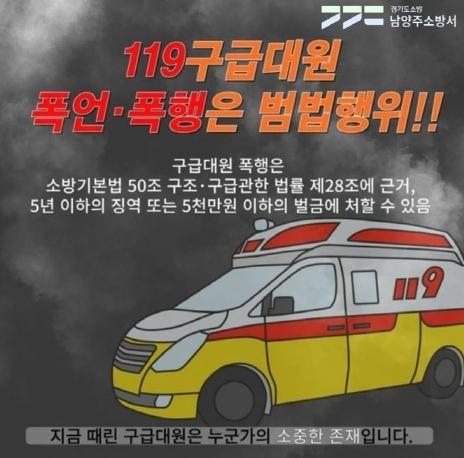 [한국뉴스타임=편집국] 남양주소방서는 올바른 119구급차 이용 문화 확산을 위해 119구급대원들에 대한 폭언 및 폭행을 금지해 달라고 당부했다.