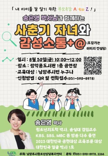 [한국뉴스타임=편집국] 남양주시는 오는 8월 30일 오전 10시부터 12시까지 정약용 도서관 1층 공연장에서 '사춘기 자녀와 감성소통'을 주제로 부모교육 특강을 개최할 예정이며, 25일부터 참여자를 모집한다.