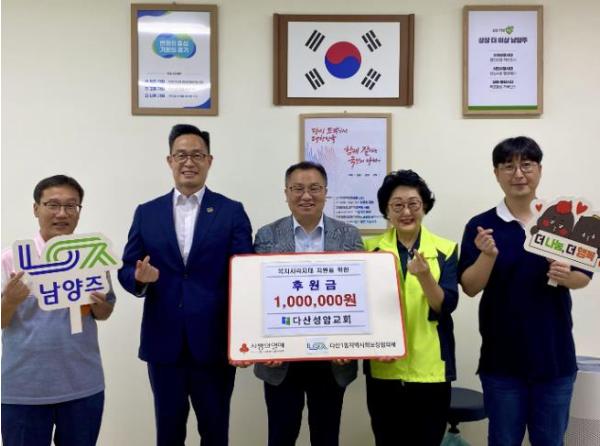 [한국뉴스타임=편집국] 남양주시 다산행정복지센터는 지난 25일 다산성암교회에서 취약계층 아동·청소년 지원을 위한 후원금 100만원을 기탁했다고 전했다.