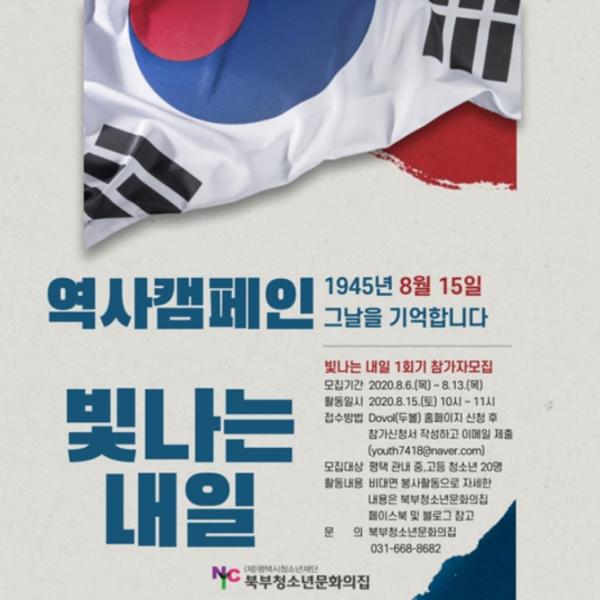 (재)평택시청소년재단(이사장 이종호) 북부청소년문화의집(관장 임병욱)에서는 8월 15일 제75주년 광복절을 맞이해 청소년들에게 올바른 역사인식과 독립운동의 정신을 알리고자 역사캠페인 ‘빛나는 내일’ 활동 참가자를 모집한다.