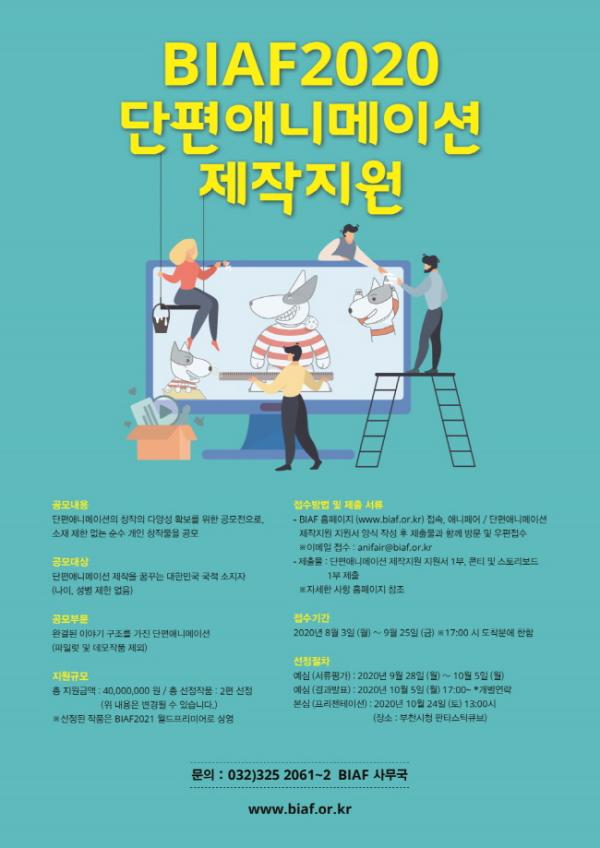 BIAF의 단편애니메이션제작지원은 국내 애니메이션 창작의 다양성을 확보하고 재능 있는 감독들을 지원하기 위한 사업이다. 올해 BIAF 단편애니메이션제작지원 공모는 8월 3일(월)부터 9월 25일(금)까지 진행된다. 단편 애니메이션을 제작하고자 하는 대한민국 국민은 누구든 지원할 수 있으며 BIAF 홈페이지에서 신청서를 다운받아 콘티 및 스토리보드와 함께 제출하면 된다.