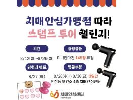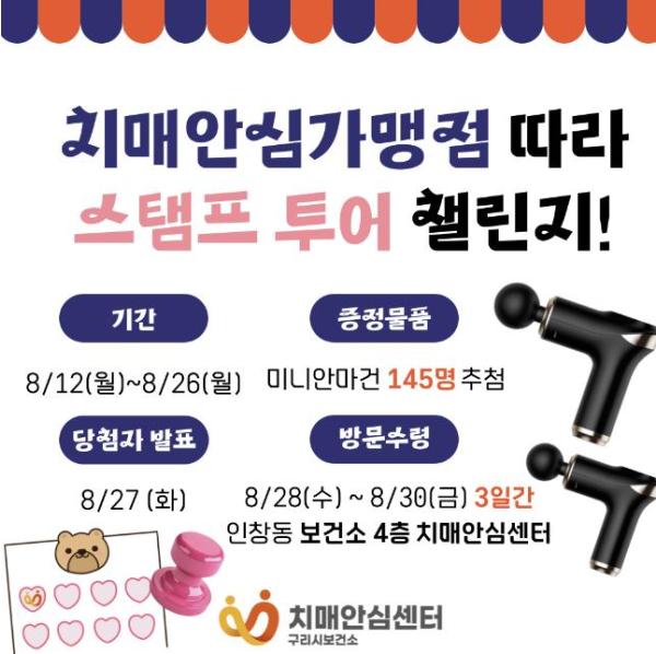 이번 행사는 휴대전화 앱 ‘워크온’ 내 ‘구리시 공식, 치매안심센터, 구리 치매안심마을 커뮤니티’ 가입자를 대상으로, 기간 내 치매안심가맹점 8곳 중 3곳 이상 방문한 사람에 대해 무작위 추첨을 통해 미니 안마건을 지급한다.