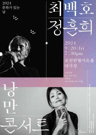 (재)포천문화관광재단은 오는 9월 20일 추석 명절을 맞아 가족 구성원 모두가 함께 즐길 수 있는 기획공연 ‘최백호·정훈희의 '낭만콘서트'를 준비했다고 전했다.