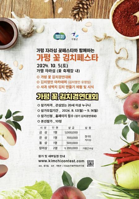 ‘특별한 날 특별한 맛 가평사과 꽃 김치!’라는 주제로 열리는 이번 대회는 향후 상품화를 위해 창의성, 식재료 구성, 상품성 등을 중요하게 심사할 계획이다. 참가자는 20세 이상 성인으로, 식문화에 관심 있는 누구나 참여할 수 있다.