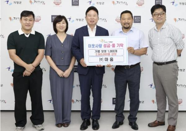 [한국뉴스타임=편집국] 가평군은 최근 ㈜마음에서 가평군청을 방문해 이웃돕기 성품으로 250만원 상당의 잣엿을 기탁했다고 밝혔다.