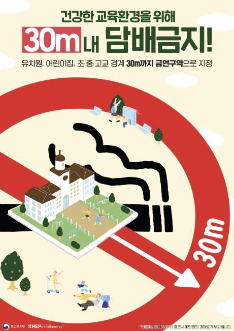 기존 금연구역은 어린이집과 유치원 시설 경계선에서 10m 이내였지만 국민건강증진법 개정에 따라 어린이집, 유치원 및 학교시설의 경계선으로부터 30m 이내로 확대됐다. 다만, 기존 조례로 지정한 학교절대보호구역(학교 출입문으로부터 50m 이내)의 금연구역은 그대로 유지된다.