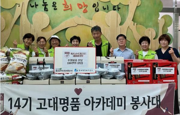 이번 후원물품은 14기 고대명품 아카데미 봉사대 회원들이 매달 십시일반 후원금을 모아 마련했으며, 백미(10kg) 12포, 라면(20개) 12박스, 김 12박스, 짜장소스 12개 등 78만원 상당의 물품으로 구성됐다.