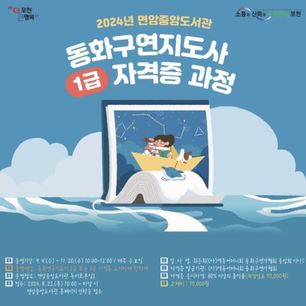 [한국뉴스타임=편집국] 포천시 면암중앙도서관은 상반기 동화구연지도사 자격증을 취득한 교육생들을 대상으로 오는 9월 4일부터 매주 수요일에 심화 전문가 과정인 동화구연지도사 1급 자격증 취득 프로그램을 10회 운영한다고 밝혔다.