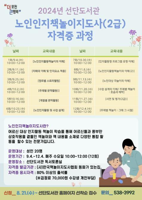 이번 과정은 오는 9월 4일부터 12월 4일까지, 총 12차시로 구성되어 있으며 출석률 80% 이상 교육에 참여하면 노인인지책놀이지도사 2급 응시자격이 주어진다. 자격증 취득 후에는 노인인지책놀이지도사로 활동할 수 있으며 향후 도서관은 배출된 지도사들이 어르신들과 활발하게 책놀이 활동을 할 수 있도록 장려하고 지원할 계획이다.