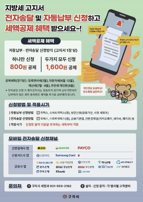 [한국뉴스타임=편집국] 구리시는 지방세 고지서 전자송달과 자동납부를 신청하면 세액공제(최대 1,600원)를 받을 수 있다고 밝혔다.