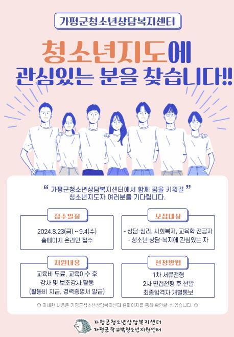 [한국뉴스타임=편집국] 가평군은 청소년상담복지센터에서 청소년 지도에 참여할 청소년지도자 전문인력 양성과정을 운영한다고 27일 밝혔다.