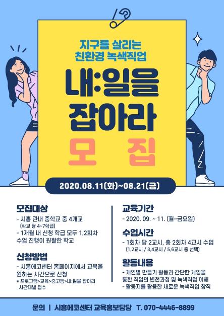 [KNT한국뉴스타임] 시흥에코센터가 친환경 녹색 직업교육을 통해 관내 중학생들의 진로 탐색을 돕기 위한 ‘내:일을 잡아라’ 하반기 교육에 참여할 학교를 모집한다.
