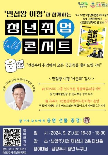 한편, 시는 취업 지원 서비스의 하나로, 오는 21일 토요일 오후 4시 30분 시청 다산홀에서 58만 구독자를 보유한 취업·자기 계발 유튜버 면접왕 이형(강사 이준희)과 함께 ‘면접부터 취업까지의 모든 것’을 주제로 ‘청년 취업 토크콘서트’를 진행할 예정이다.