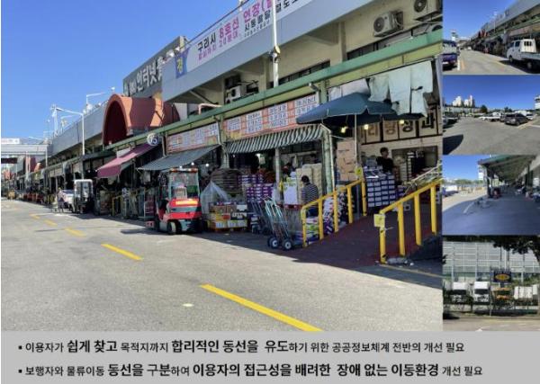 이번 사업은 구리농수산물도매시장 청과물동 일대에 총사업비 5억원(도비 1억5천, 시비 3억5천)을 투입해 ▲안전하고 편리한 보행자 중심의 공간환경 조성 ▲주차장과 접근 공간 연결 보행통로 확보 ▲경사로, 계단 등 접근 및 이동 공간 개선 ▲공공정보매체 디자인 재정비로 안전한 배려길과 찾기 쉽고 편리한 품격 있는 공간을 조성하고자 한다.
