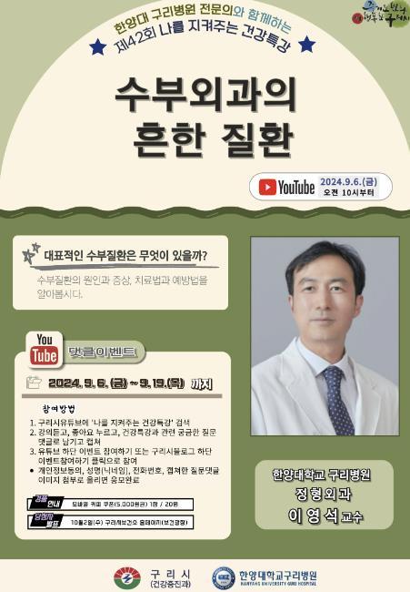 [한국뉴스타임=편집국] 구리시는 6일 공식 유튜브 구리비전을 통해 ‘수부외과의 흔한 질환’이라는 주제로 제42회‘나를 지켜주는 건강특강’을 운영했다.