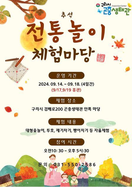 [한국뉴스타임=편집국] 구리시는 2024년 추석을 맞이하여 구리시 곤충생태관에서‘추석 민속 전통놀이 체험마당’을 운영할 계획이라고 밝혔다.
