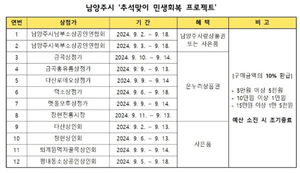 ‘추석맞이 민생회복 프로젝트’는 경기도시장상권진흥원과 협력을 통해 상점가에서 5만원 이상 결제한 시민에게 구매 금액의 10% 금액을 온누리상품권, 남양주사랑상품권 또는 사은품으로 돌려주는 사업이다.