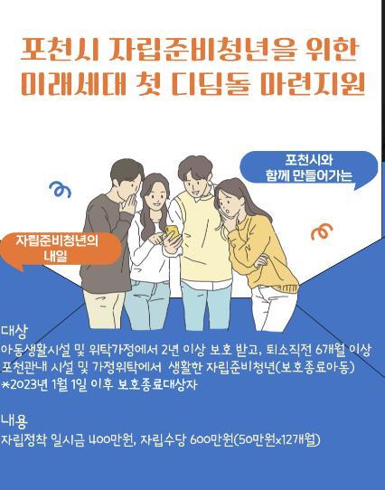 한편, 포천시는 자립준비청년이 사회에 진출하는데 소요되는 비용 부담을 완화하기 위해 ‘포천시 미래세대 첫 디딤돌 마련 지원’을 시행하고 있다.