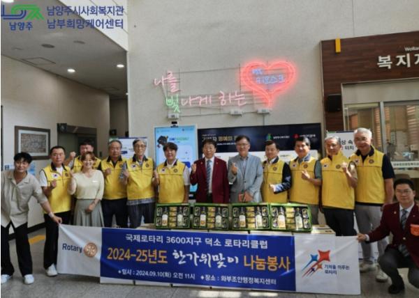 [한국뉴스타임=편집국] 국제로타리 3600지구 덕소 로타리클럽은 지난 10일 취약계층을 위해 2,000만 원 상당의 추석 선물 세트를 남양주시 사회복지관 남부희망케어센터에 전달했다.