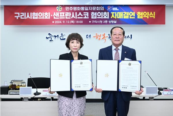 [한국뉴스타임=편집국] 구리시는 9월 12일 구리시청 3층 상황실에서 백경현 구리시장을 비롯한 민주평통 자문위원 등 60명이 참석한 가운데 민주평화통일자문회의 구리시협의회와 샌프란시스코협의회가 자매결연식을 가졌다고 전했다.