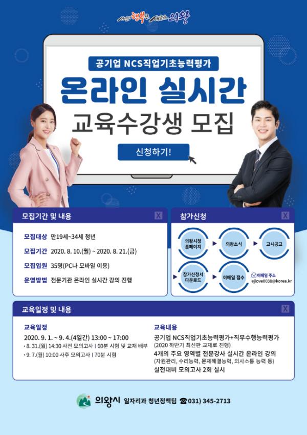의왕시(시장 김상돈)는 지난 6월 공기업 NCS직업기초능력평가를 위한 ‘NCS집중캠프’를 집합교육으로 실시한데 이어, 오는 9월에는 온라인 실시간 강의로 프로그램을 진행한다고 밝혔다.