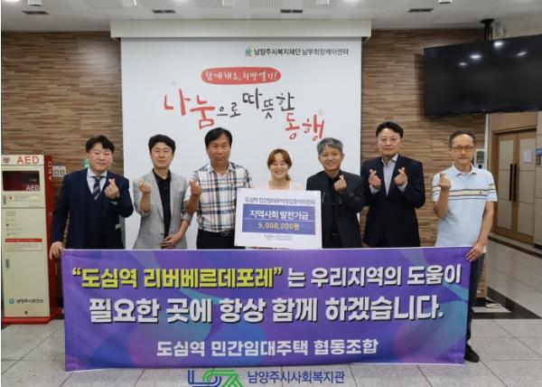 [한국뉴스타임=편집국] 도심역 민간임대주택 창립준비위원회는 지난 12일 지역사회 발전을 위한 후원금 500만 원을 남양주시 사회복지관 남부희망케어센터에 전달했다.