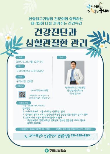 [한국뉴스타임=편집국] 구리시는 9월 23일 보건소 지하 대강당에서 심뇌혈관질환 예방관리를 위한‘제43회 나를 지켜주는 건강특강'을 대면으로 운영한다.