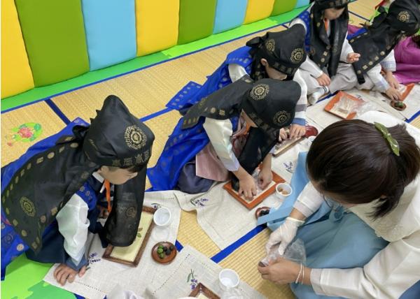 먼저 수업에 참여한 아이들은 전통 예절 수업에서 △인사법 △공공장소 예절 △높임말 △절하는 법 △전통 한복 착용법 등을 배우는 시간을 가졌다. 또한, 전통 다례 및 다도 예절 수업에서는 차(茶)의 9가지 덕(德)에 대해 이해하고 다식을 만드는 등 다양한 체험을 했다.