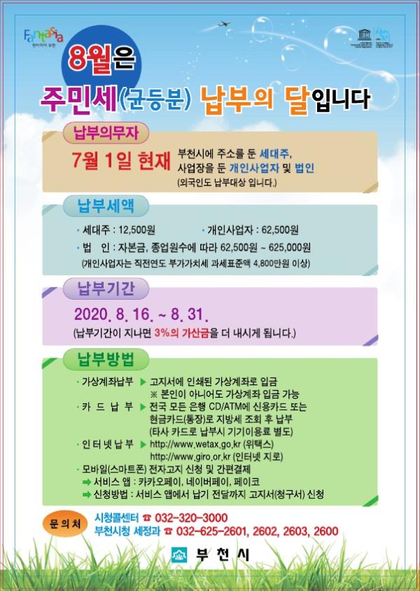 기타 주민세 납부와 관련한 문의사항은 부천시 콜센터(☎032-320-3000)나 세정과(☎032-625-2600∼2603)으로 연락하면 된다.