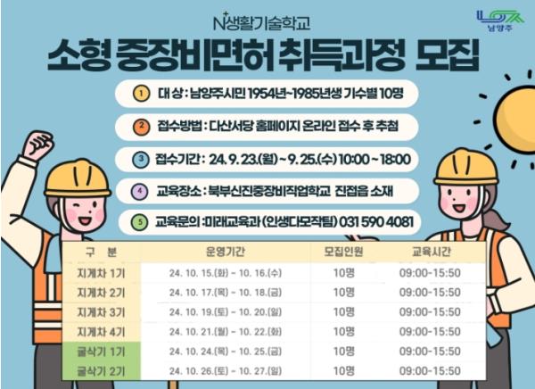 [한국뉴스타임=편집국] 남양주시는 중장년층의 안정적인 사회진출과 취업기회를 확대하기 위한 N? 생활기술학교 소형중장비면허 취득과정의 하반기 교육생을 오는 23일부터 25일까지 3일간 모집한다.