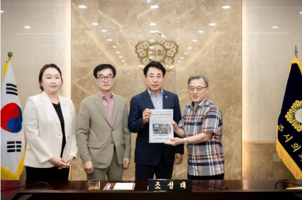 이날 간담회에서 조성대 의장은 주민대표로부터 차산초등학교 주변 도로 확장공사 시행을 염원하는 서명부를 전달받았으며 이상기, 전혜연 의원과 함께 △통학차량의 회차공간부족 △ 등원시간의 교통 혼잡 등 차산초등학교 통학로의 이용 관련 애로사항을 청취했다.