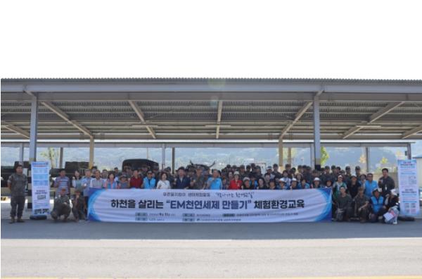 이날 활동에서는 한강지키기운동본부 회원들을 비롯한 박재영 화도수동행정복지센터장, 육군 제1045부대 석진오 부대장 및 장병, 지역 주민 등 약 150명이 참여한 가운데 ▲유용미생물(EM용액) 강의 ▲EM천연세제만들기 ▲EM흙공 투척 활동 등이 진행됐다.