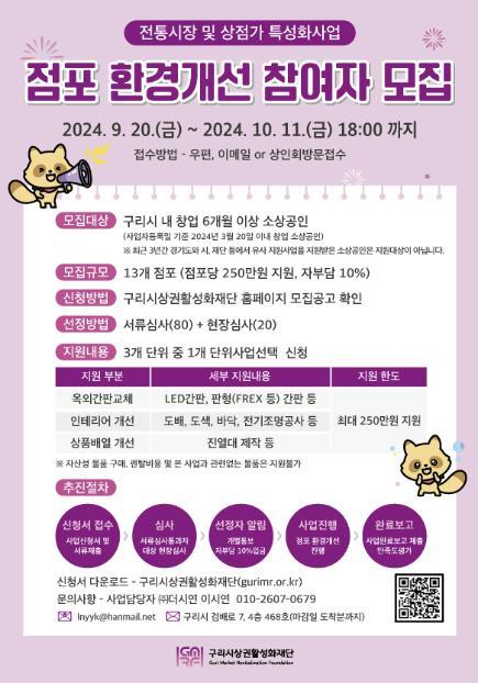 [한국뉴스타임=편집국] 구리시상권활성화재단은 9월 20일부터 구리시 소상공인들을 대상으로 경영 안정화와 경쟁력 강화를 위해 점포 환경개선 지원 사업 참여자를 모집한다고 밝혔다.
