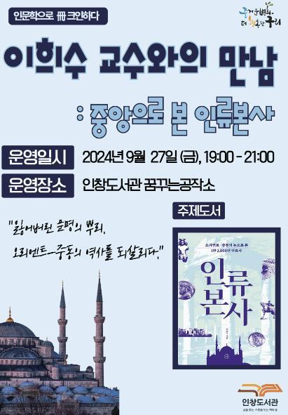 [한국뉴스타임=편집국] 구리시는 오는 9월 27일 인창도서관 꿈꾸는 공작소에서 "낙낙(樂樂)한 도서관, 인문학으로 책(冊)크인하다" 하반기 세 번째 프로그램으로'이희수 교수와의 만남 : 중앙으로 본 인류본사'를 운영한다.