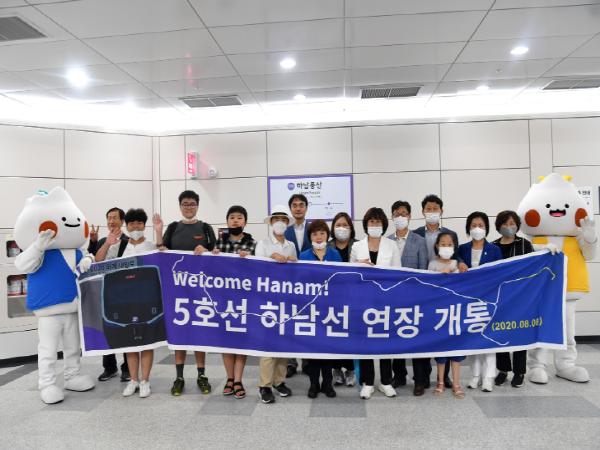 [KNT한국뉴스타임] 하남시 김상호 시장은 지난 8일 하남풍산역에서 지하철 5호선 최초 운행을 기념하기 위해 첫차를 탑승하는 승객과 함께 지하철 운행을 축하하는 이벤트를 가졌다.