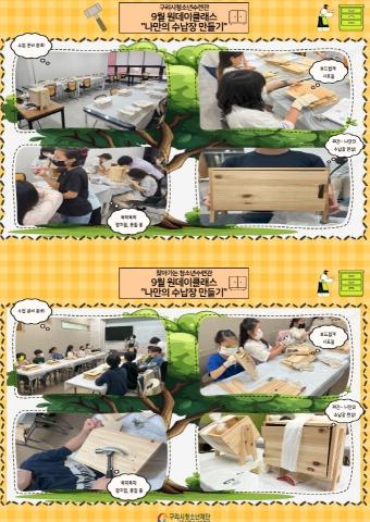 [한국뉴스타임=편집국] 구리시청소년재단 청소년수련관은 관내 청소년들이 직접 수납장을 만드는 과정을 통해 자아 표현과 디자인 감각을 키우고 자연 보호의 중요성을 인식할 수 있도록‘9월 25일 문화창작교실’,‘10월 5일 찾아가는 청소년수련관’을 통해‘나만의 수납장 만들기’원데이클래스를 운영했다.