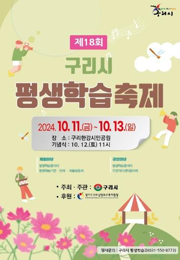 [한국뉴스타임=편집국] 구리시는 2024년 10월 11일부터 13일까지 구리한강시민공원에서 구리시 평생학습동아리와 평생학습 관계자들이 한 해 동안 배우고 익힌 학습 결과물을 발표하고 일반 시민들과 평생학습의 즐거움을 나누기 위해'제18회 구리시 평생학습축제'를 개최한다.