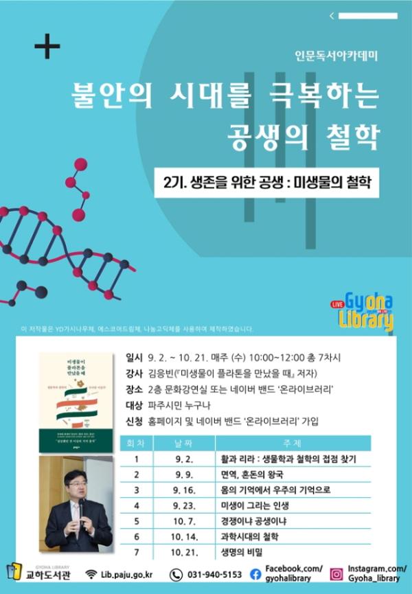 [KNT한국뉴스타임] 파주시 교하도서관은 인문독서아카데미 2기 ‘생존을 위한 공생 : 미생물의 철학’ 수강생을 모집한다고 11일 밝혔다.