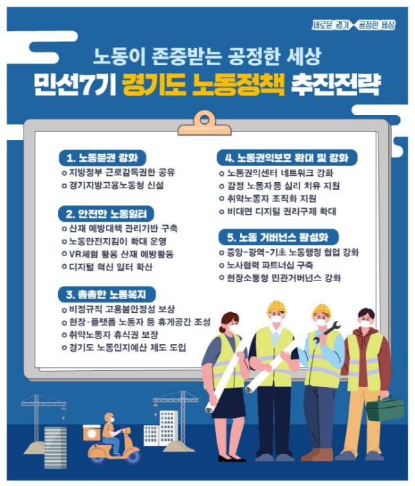 이에 경기도는 ‘노동이 존중받는 공정한 세상’을 민선7기 노동정책 비전으로 확립하고 ①노동분권 강화 ②안전한 노동일터 조성 ③촘촘한 노동복지 실현 ④노동권익보호 확대 및 강화 ⑤노동 거버넌스 활성화 등 5개 분야 추진전략을 설정해 다양한 정책과 사업들을 추진한다.