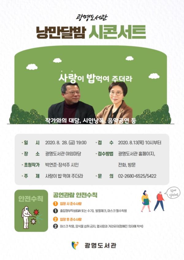 광명도서관 특성화 사업인 ‘시가 있는 도서관’ 프로그램의 일환으로 마련된 이번 시(詩)콘서트는 ‘사랑이 밥 먹여 주더라’를 주제로 박연준, 장석주 시인과의 대담, 시인낭송을 비롯해 음악공연도 함께 예정되어 있어 코로나 19로 지친 시민들에게 여름밤 큰 위로가 되어줄 것으로 기대된다.