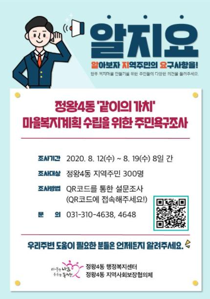 [KNT한국뉴스타임] 시흥시 정왕4동 행정복지센터(동장 서명범)와 정왕4동 마을복지계획 추진단은 8월 12일부터 19일까지 8일간 마을복지계획 관련 주민 설문조사를 실시한다.