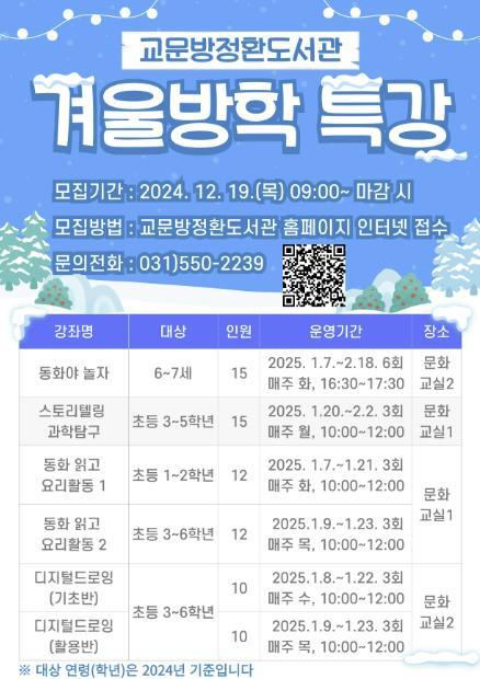 ▶ 교문방정환도서관은 1월 7일부터 2월 18일까지 동화책과 놀이를 통해 자기표현 능력을 향상하는 '동화야 놀자', 재미있는 실험을 스스로 해보며 과학적 호기심 충족 및 원리를 깨치는 '스토리텔링 과학탐구', 책과 연계한 음식 만들기를 통해 창의력 향상 및 즐거운 활동시간을 가지는 '동화 읽고 요리활동', 테블릿 PC를 이용하여 드로잉 기초과정을 배우며 나만의 소품을 제작해보는 '디지털 드로잉 '등 6강좌를 운영한다.